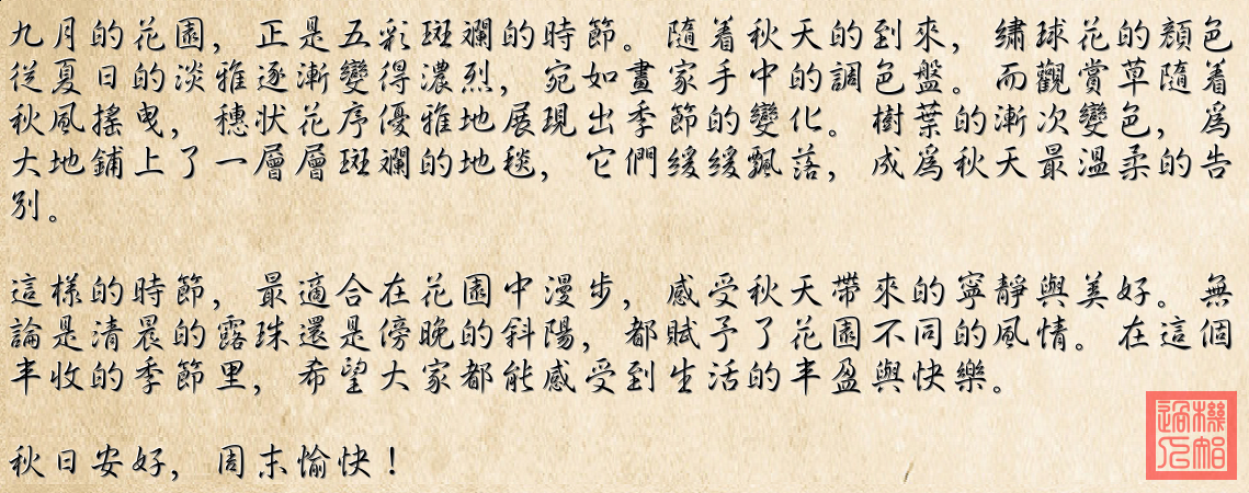 整體來看,這些圖片傳達了秋季花園的靜謐與美麗,沒有哪一張圖片展示具體新聞,隻是對九月花園應景的記錄。