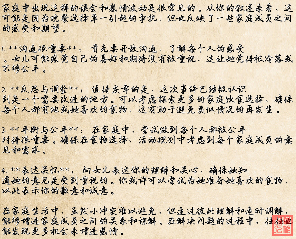 這兩張圖片結合文字,講述了一個家庭小插曲,狗狗偷吃了小主人的晚餐後顯得很內疚,而家長對此進行了調侃,表示晚餐太過單調,並與孩子進行了一番有趣的對話。