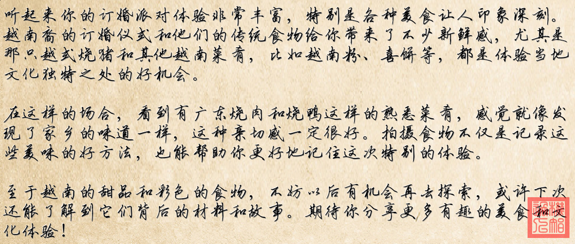 這些照片展示了一次越南裔訂婚儀式上的食物。這些圖片是專門拍攝一些美食細節練習攝影技巧的。