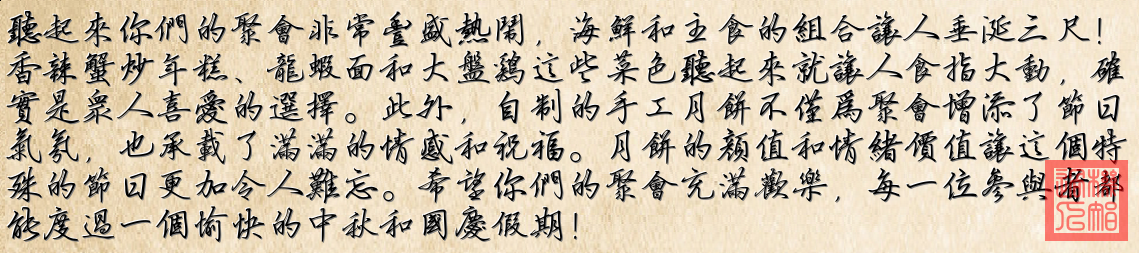 從這些圖片中可以看出,這次聚會的主菜主要是海鮮,配有香辣蟹炒年糕、龍蝦麵和大盤雞等受歡迎的主食。此外,還有各種海鮮如鮮蝦、龍蝦、魚等,還有精美的手工月餅和水果拚盤應節。