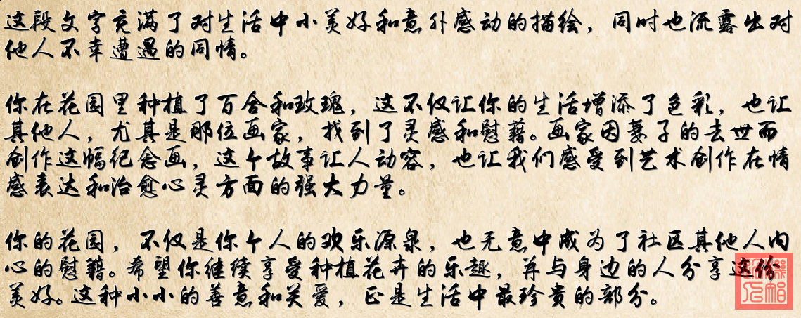 這些花朵使花園顯得充滿活力,不僅僅給主人帶來快樂,也讓路過的人感受到生活的美好。據文中提到的故事,這些花對附近人們也產生了積極的影響。