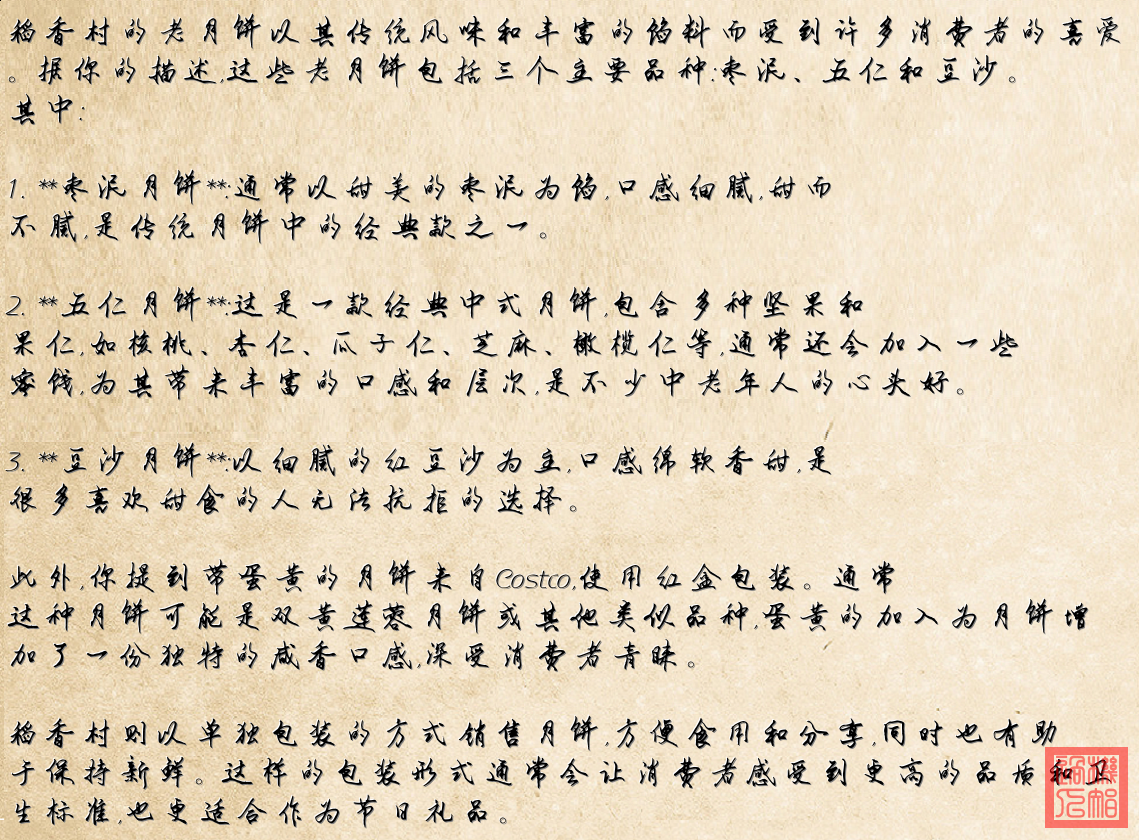 - 包裝盒上寫著“老月餅”,有傳統五仁月餅、傳統棗泥月餅、傳統豆沙月餅,具體重量和數量也標示出來。