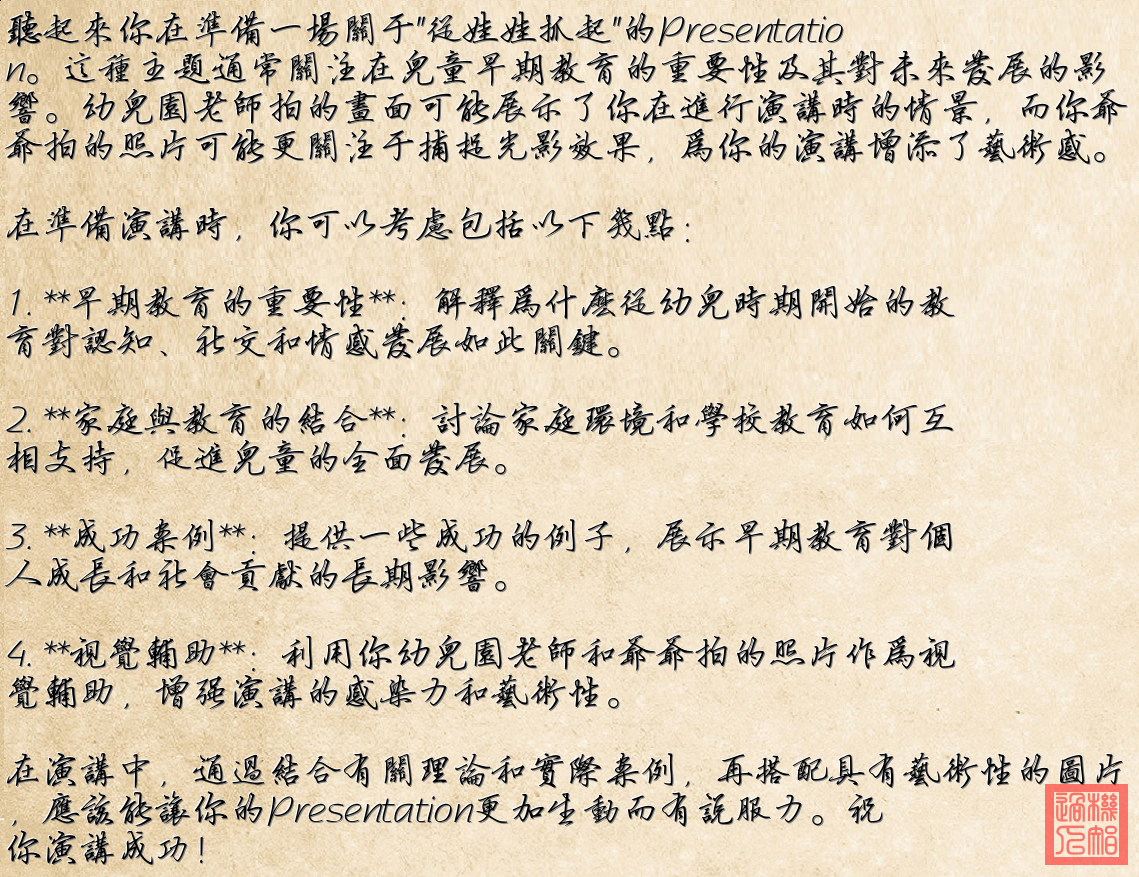 - 一位大人坐在一旁微笑,可能是幼兒園的老師,手裏拿著記錄用的材料。