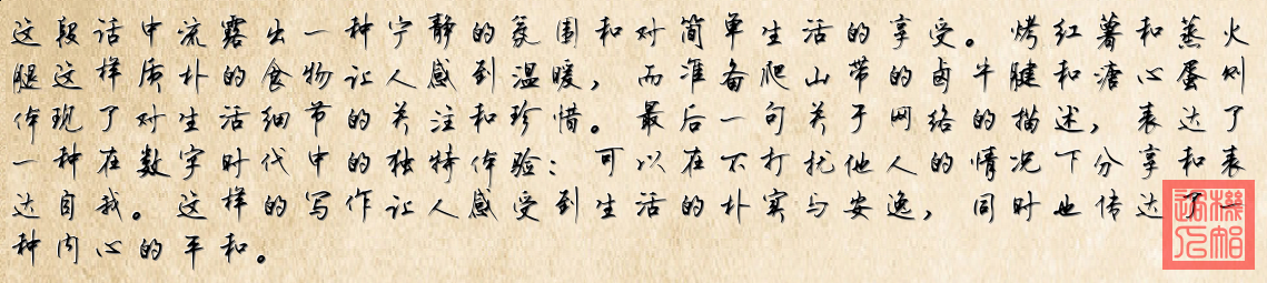 《食光備忘錄》 晨光裏紅薯靜靜躺在竹籃 細長身形裹著泥土的芬芳 蒸汽朦朧中火腿輕輕搖晃 明天山路在夢裏沙沙作響 牛腱在鹵汁中沉醉安眠 琥珀色紋理像月光的詩篇 溏心蛋裹著深夜的溫柔 小美的圍裙係著整個秋天 網絡那頭世界喧鬧繁忙 我在這裏寫下明日的行囊 隻有廚房聽得見心跳聲響 食材在寂靜中悄悄發光 烤箱亮起橘色的呼吸燈 山風已等在黎明的轉角 當背包裝滿這些溫暖記憶 每一步都踏著煙火的味道