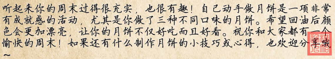 《小月餅手記》 麵粉在指尖跳舞 糖霜輕吻著晨光 三十個月亮悄悄成型 紅豆沙 蓮蓉 棗泥在歌唱 烤箱裏金色波浪 香氣爬上玻璃窗 等待時間施魔法 讓顏色暈染成詩行 小小的圓 暖暖的甜 每個褶皺都是溫柔記號 周末的午後 幸福正發酵 把月光包進這掌心城堡 晾涼的不隻是餅皮 還有忙碌時的小煩惱 當回油完成那刻 生活又添一道甜味注腳