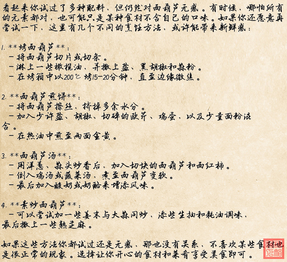 整個過程展示了西葫蘆從原料到美食的轉變,雖然你對其“無感”,但從圖片看來,它還是一道精心烹製的料理。