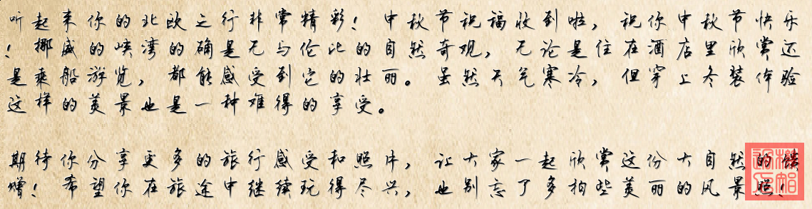 這些照片主要突出了挪威自然景觀的精美與旅行中的舒適體驗。