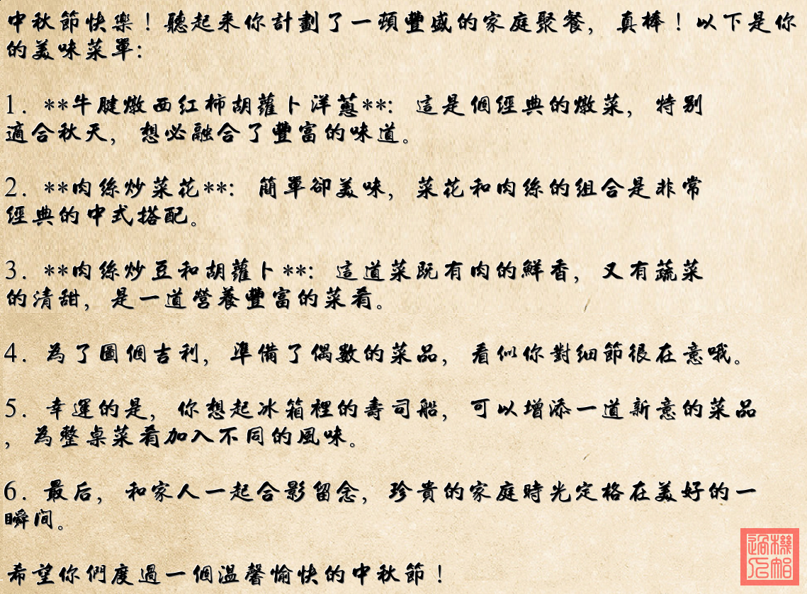 中秋節快樂!看起來您準備了一頓豐盛的晚餐,這裏是每道菜的介紹: