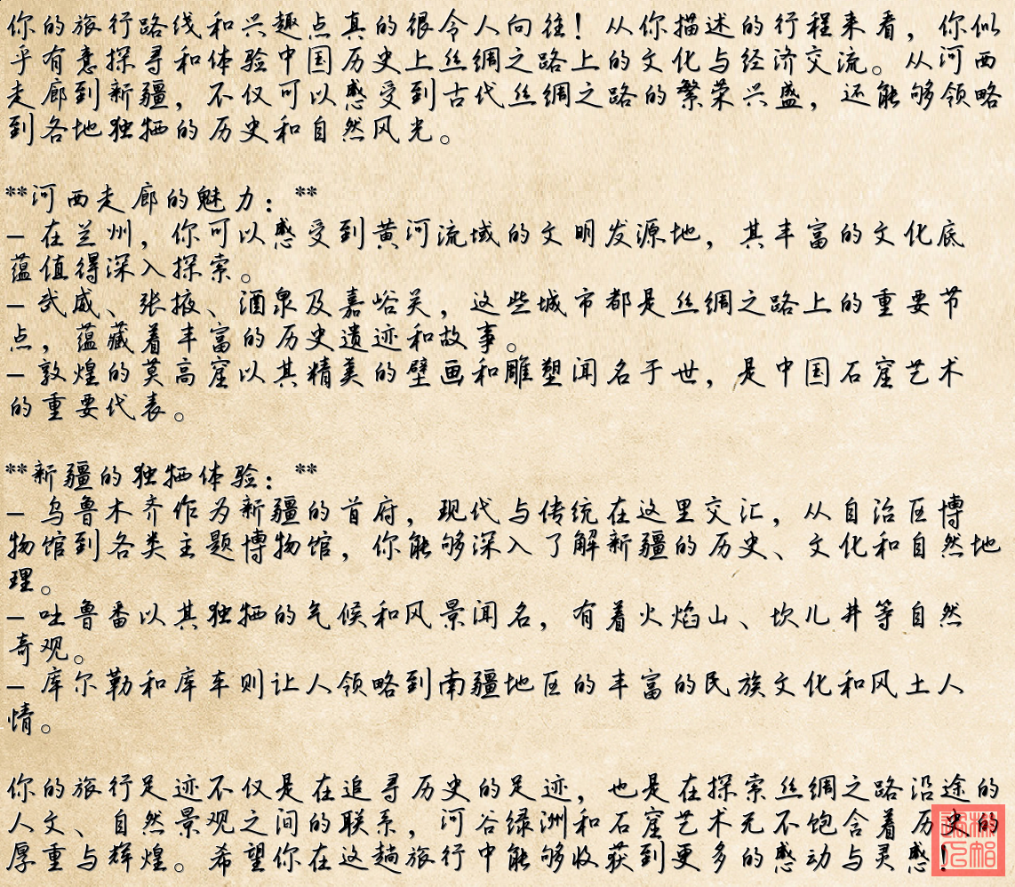 《絲路回響》 駝鈴搖碎大漠月光 綠洲城邦燈火未央 商隊載著瓷器和詩行 在星軌交織的路上 斷壁殘垣訴說輝煌 長城蜿蜒連著遠方 都護府印信映著斜陽 見證千年風沙浩蕩 從蘭州城到嘉峪關 丹霞染紅河西走廊 莫高窟裏飛天輕揚 月光照亮經卷千行 烏魯木齊不是中轉 博物館裏歲月流淌 吐魯番的葡萄飄香 龜茲樂舞仍在回響 河穀深處鍾聲悠揚 石窟刻滿祈願目光 商旅穿過胡楊林場 留下文明交錯光芒 今夜我站在這片土壤 聽見曆史在風中吟唱 絲綢古道通向八方 仍是人間煙火滾燙