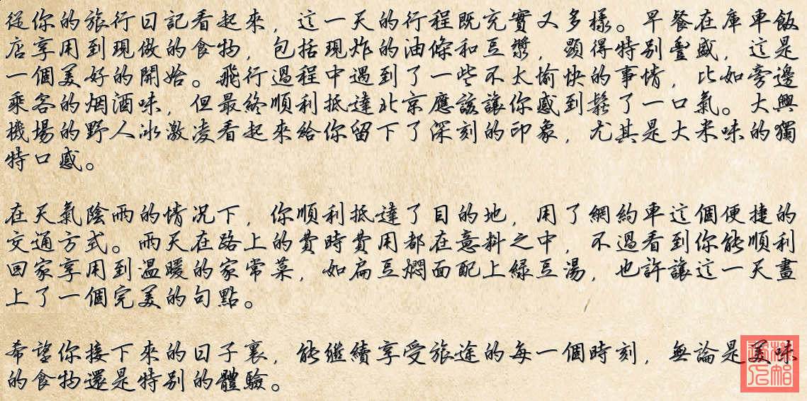 《晨光漫遊記》 晨光灑在庫車飯店的餐桌 現炸油條飄著故鄉的溫熱 豆漿碗裏映著啟程的雲朵 行囊裝滿西域清晨的承諾 鐵鳥掠過天山終年的積雪 三萬英尺翻閱時光的書頁 鄰座飄來隔夜的煙草氣息 在密閉空間裏寫漂泊筆記 大興機場的燈火接住黃昏 冰淇淋融化在疲憊的嘴唇 大米香氣裹著輕盈的乳酪 衝淡了旅人眉間的風塵 雨幕垂落華北平原的夜晚 計價器跳動歸心似箭 五十公裏變作數字的河流 穿過霓虹編織的京城畫卷 蕎麥麵在瓷碗裏升起雲霧 綠豆湯盛著三碗鄉愁 扁豆燜麵纏繞著家的溫度 在雨聲裏把風塵輕輕簽收 每個驛站都是臨時的句讀 每片雲朵都在說繼續遠遊 當行囊沾滿四時的晨露 才懂得漂泊是為了更好停留