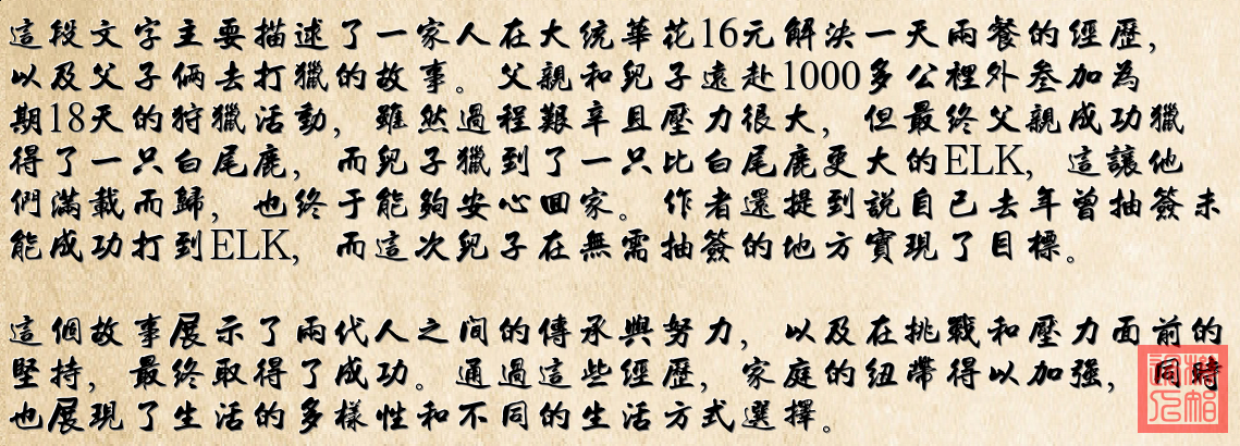 - 文字描述了父子倆和獵友去打獵的經曆。他們遠赴1000多公裏的地方尋找獵物,經過一番努力,終於成功打到了一隻公白尾鹿和一隻ELK(馬鹿)。這個經曆反映了一種冒險和挑戰的生活方式,以及最終取得成功的滿足感。