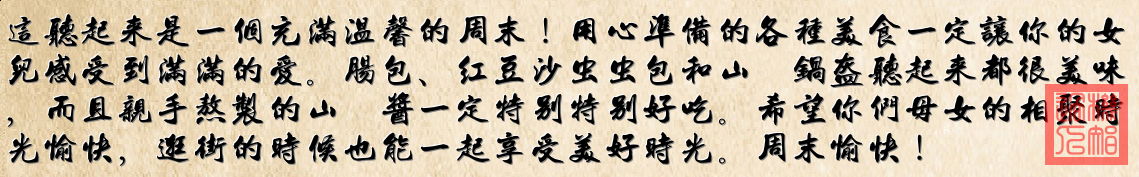 《歸家的甜香》 晨光揉進麵粉裏 烤箱哼著溫暖旋律 紅豆沙在掌心纏繞 捏成小蟲等妳來瞧 山楂樹搖落紅寶石 咕嘟咕嘟熬成詩 鍋盔藏著酸甜心事 比月亮更圓的相思 車輪碾過梧桐影 茶香飄在舊街景 紙袋裝著剛出爐的秋意 接妳回到童年光陰 不必說謝謝或客氣 看妳咬下酥皮時眼睛亮晶晶 那碎屑落在衣襟 就是我最想要的星星