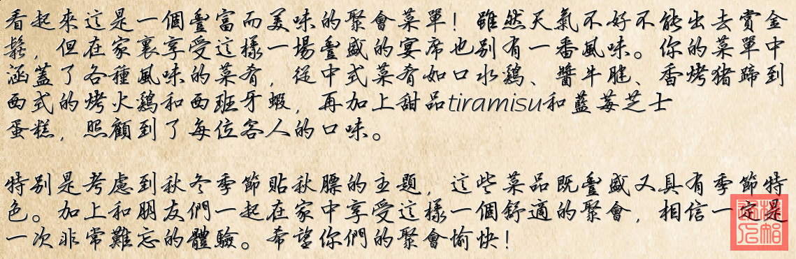 這些圖片反映了烹飪準備過程,特別是為秋冬季聚會準備的豐富菜單,包括了各種可口的菜肴和甜點。