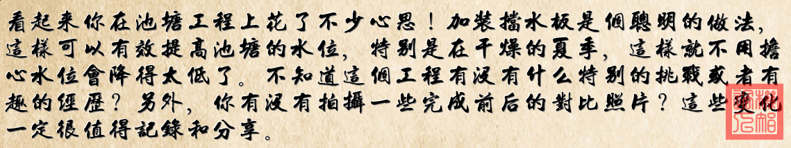 看來你完成了一項池塘改造工程。從圖片中可以看到: