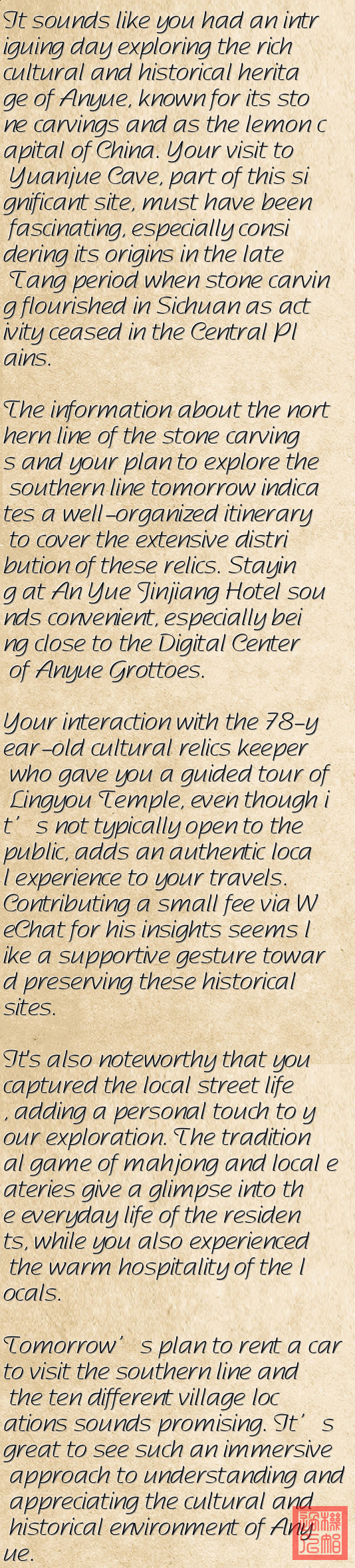 《石刻時光》 機翼掠過雲層俯瞰 穿越山河的航線 北京成都到安嶽 開啟尋訪的篇章 錦江賓館的婚禮進行曲 與千年石刻遙相望 街邊麵館升騰的霧氣 喚醒沉睡的味蕾記憶 圓覺洞前拾級而上 晚唐匠魂在石間流淌 北崖造像靜默守望 訴說佛光千年的滄桑 檸檬花香漫山崗 石刻之鄉美名揚 滴滴車輪碾過鄉路 探訪散落的藝術寶藏 靈遊院門輕叩響 七旬守護者鬢如霜 雞鵝成群農家院 五代石窟現真章 千佛寨前暫留步 轉道市井煙火處 麻將聲裏光陰慢 橙貓慵懶臥牆頭 檸檬攤前金光閃 石刻南北線蜿蜒 明日再續探尋路 巴蜀瑰寶永流傳