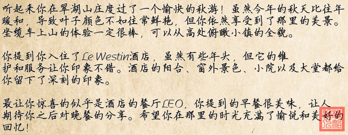 這些圖片共同呈現了翠湖山莊的秋季風光、小鎮風情及酒店的舒適體驗。