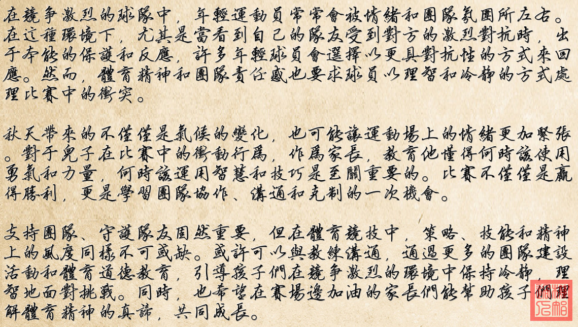 整體反映了一些家長對競技體育中文化的反思,特別是在年輕球員的教育和行為規範方麵。