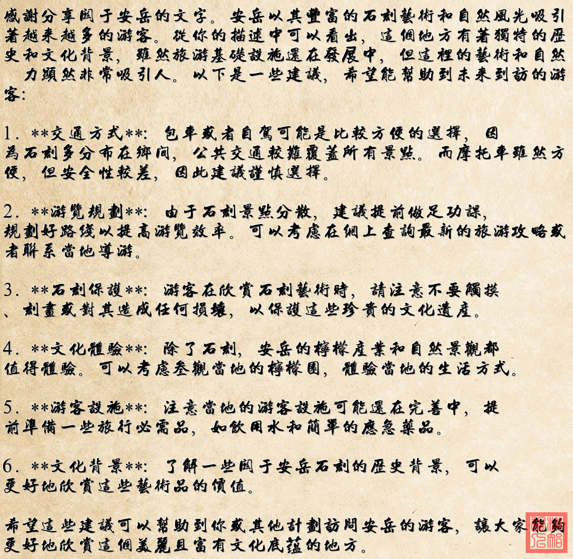 4. **文旅發展**:安嶽的旅遊設施正在慢慢改善,但發展仍然受到資金和地質景觀匱乏的限製。