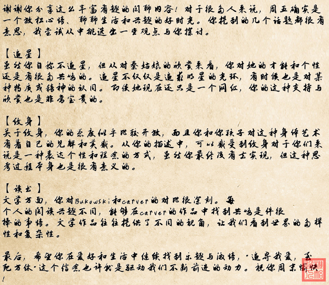 這篇文章還提到關於追星、紋身以及讀書的個人經曆與感受,探討了一些網紅現象及其影響,也涉及對文學作品及作家的看法。