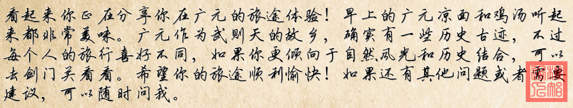 整體來看,這係列圖片主要展示了在廣元的早餐體驗,包括涼麵和雞湯等當地特色美食,以及相關的餐廳環境和一部分城市風景。