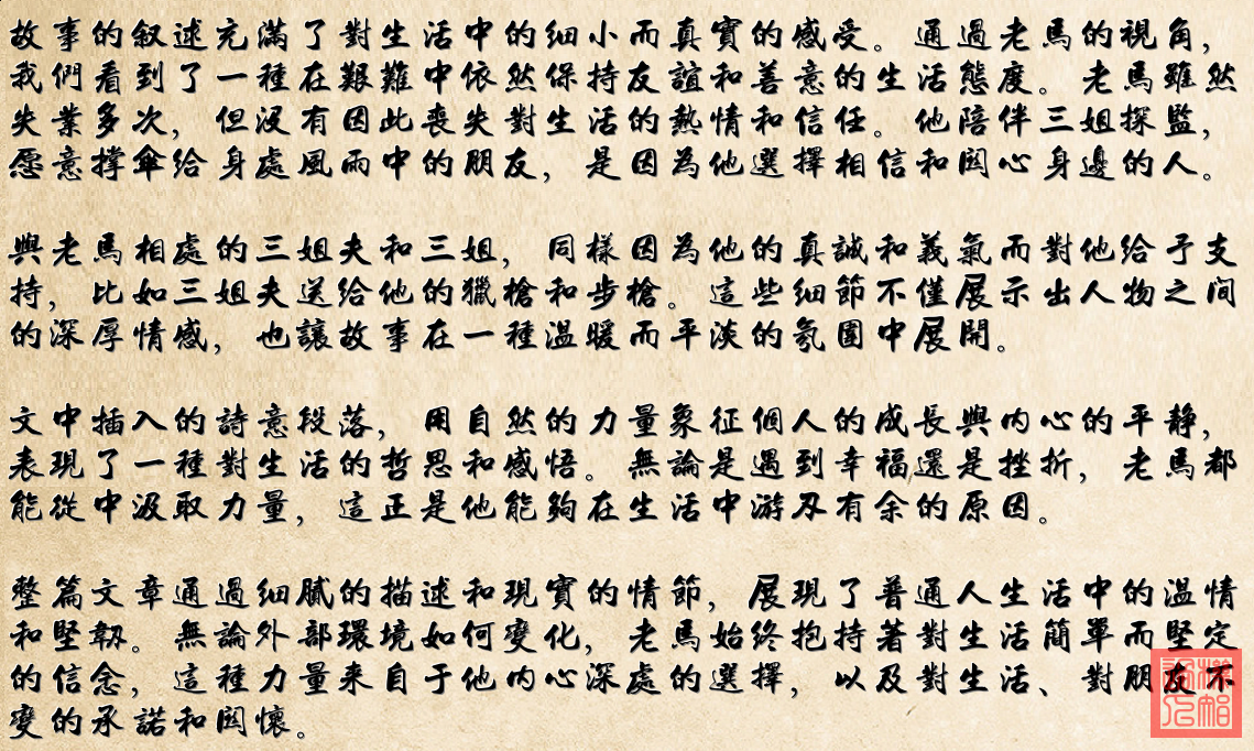 這些圖片似乎描述了一個強調日常生活與友情的敘述,沒有明確的新聞事件。上述的背景故事主要圍繞老馬、三姐及其家庭的日常生活、人際關係,以及失業後的生活狀態。