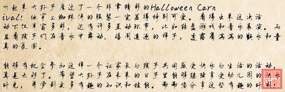 《小蜘蛛俠的萬聖節》 陽光透過梧桐葉灑在校門 等待兩年的名單終於成真 你背著書包走進童話城堡 每天帶回滿口袋的星星 放學鍾聲敲響的黃昏 蜘蛛俠戰衣閃著藍光 牽著大手穿過氣球拱門 南瓜燈在路邊眨著眼睛 轉盤轉出彩虹色的驚喜 吉他弦上跳著歡快音符 你和夥伴追逐金色秋風 鬥篷在暮色裏劃出弧線 當月光爬上滑梯頂端 你說老師像糖果般甜美 那句讚美讓晚風都變甜 笑聲落進成長的紀念冊 糖果裝滿橙色小桶 回憶裝滿時光相冊 蜘蛛網兜住今夜月光 明天又要去童話王國探險