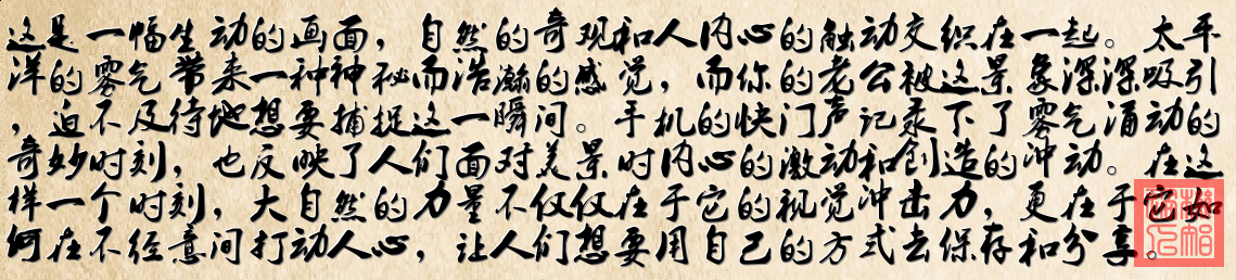 《霧色時光》 海霧漫過腳邊的細沙 太平洋的風輕吻著晚霞 棕櫚樹在暮色裏搖曳 像誰遺落的童話 粉橙色天空漸漸融化 浪花在礁石上開出碎花 你舉著手機追著光 定格了時光的魔法 木棧橋上飄來圓號的嗚咽 陌生人分享著屏幕裏的世界 鏡頭裏裝著整片海平線 還有比夕陽更暖的笑顏 當潮水帶走白日的喧囂 我們變成沙灘上的剪影 在霧與光的交界處 聽見幸福輕輕靠岸的聲音