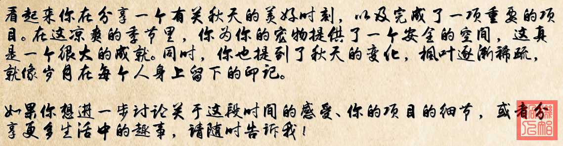 《秋日圍欄》 鐵網在夕陽下泛著銀光 圈起六英畝金色牧場 落葉在圍欄邊打著旋兒 像那年飄走的時光 池塘倒映著楓葉的衣裳 樹影斑駁如記憶泛黃 你揮拍劃破秋日的晴朗 球場上青春正在發燙 圍欄外季節換了模樣 圍欄內腳步依然鏗鏘 從青澀到八點五的成長 就像年輪刻進白楊 當新雪覆蓋木質球網 冰霜會記住每個願望 在圍欄守護的這片土壤 春天正孕育在霜降