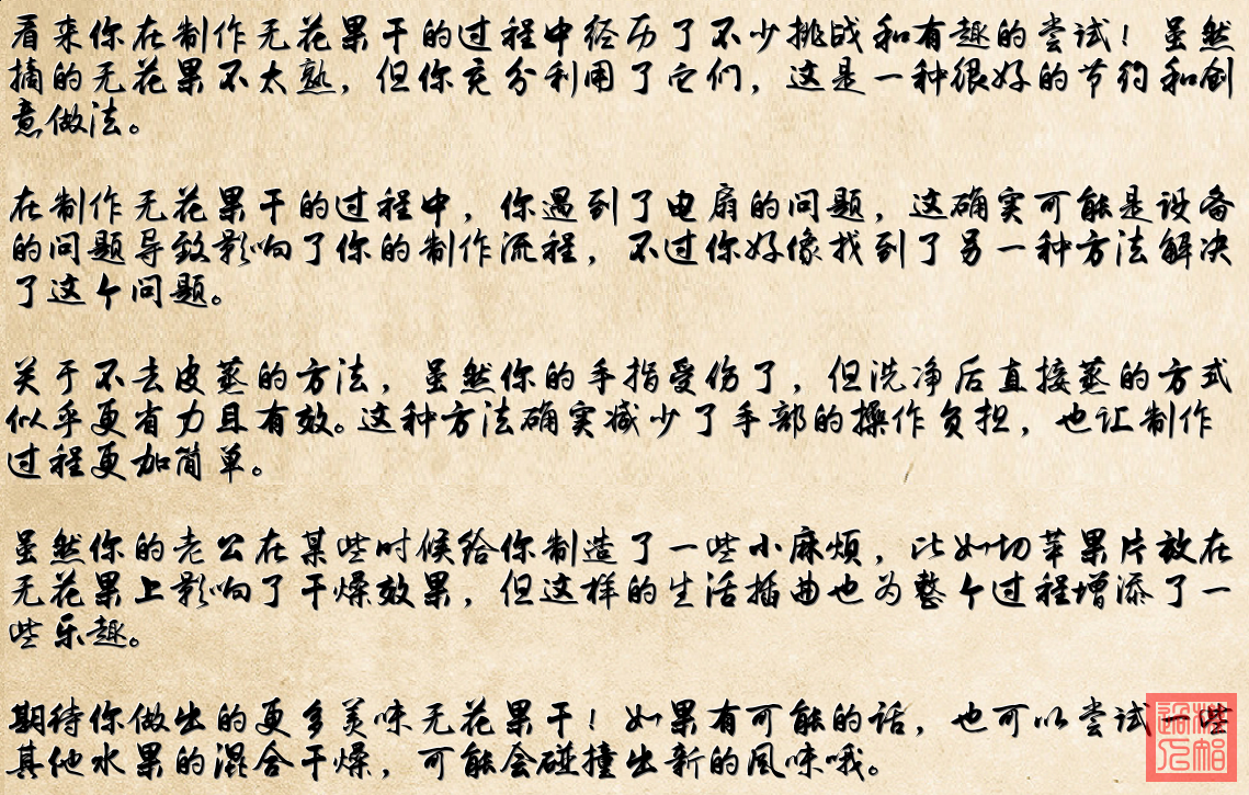 整個過程詳細展示了從摘取、清洗、去皮、蒸製到烘幹每一個步驟的變化和結果,最終製作出成品無花果幹。照片細節豐富,能夠幫助讀者了解無花果幹的製作過程以及可能麵臨的挑戰,比如去皮導致的手受傷和設備的局限性。