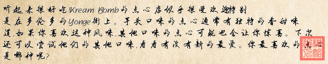這些圖片展示了一種名為Kream Bomb的點心,來自多倫多Yonge街上的一家店。這種點心有多種口味,你展示的是其中的芋頭味。圖片中可以看到這個點心外形類似於一個立方形,表麵金黃酥脆,上麵有芋頭味的裝飾和一片薄片,可能是芋頭片。切開的圖片顯示了其內部也是芋頭味奶油餡,層次分明。