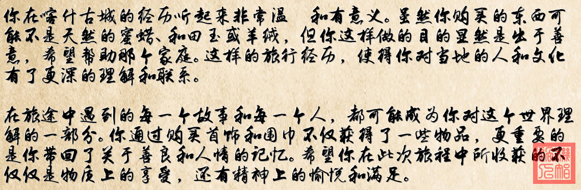 《古城星光》 晚風輕拂石板路 古城燈火漸模糊 兩個身影櫃台後 眼眸清澈如朝露 石榴汁的甜香還未散 你帶我穿過黑暗的轉彎 小小手掌護住陌生過客 這份溫暖勝過萬語千言 月光灑在五彩石上 羊絨圍巾泛著微光 八千塊換來的不隻是 那些會褪色的珍藏 斷開的珠鏈重新串起 你說這是緣分的印記 六百塊塞進孩子手心 看見星光落進他們眼底 旅途中總有不期而遇 比風景更美的是善意 或許明天各奔東西 但這片刻已成永恒詩句 當霓虹淹沒古老城牆 總有人守著最初善良 就像那夜古城的星光 靜靜照亮回家的方向