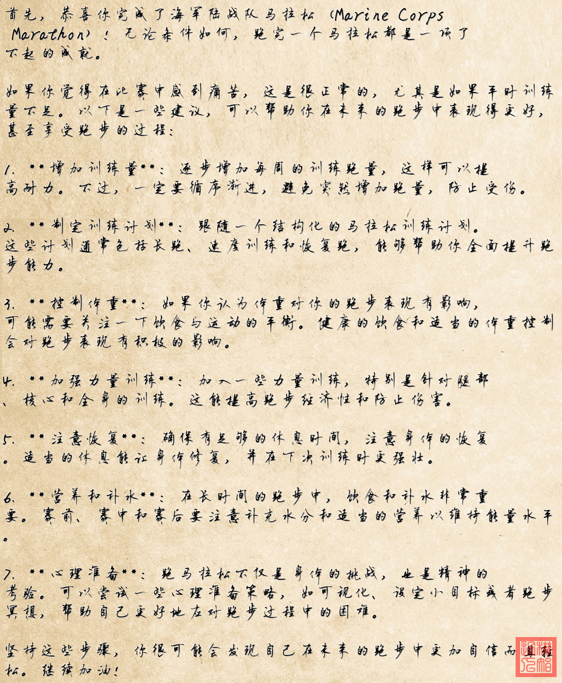 無論在過程中感到多麽痛苦,完成馬拉鬆都是一項了不起的成就!繼續加油,保持運動!