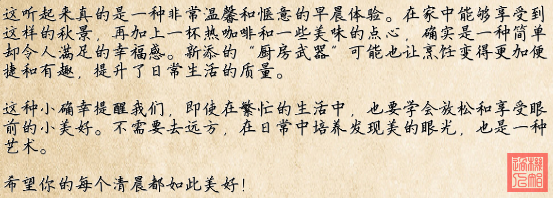 從你的描述和圖片中可以看出,你家早餐間的窗外可以看到美麗的秋景,顏色豐富,非常賞心悅目。第一張圖展示了窗外的紅色秋葉,室內有裝飾花瓶,顯得溫馨。第二張圖片中,是一台新的咖啡機,型號為DeLonghi Dinamica Plus,看起來功能齊全。這讓你可以在家中享受咖啡和點心,同時觀賞美景,帶來了簡單的幸福和滿足感。