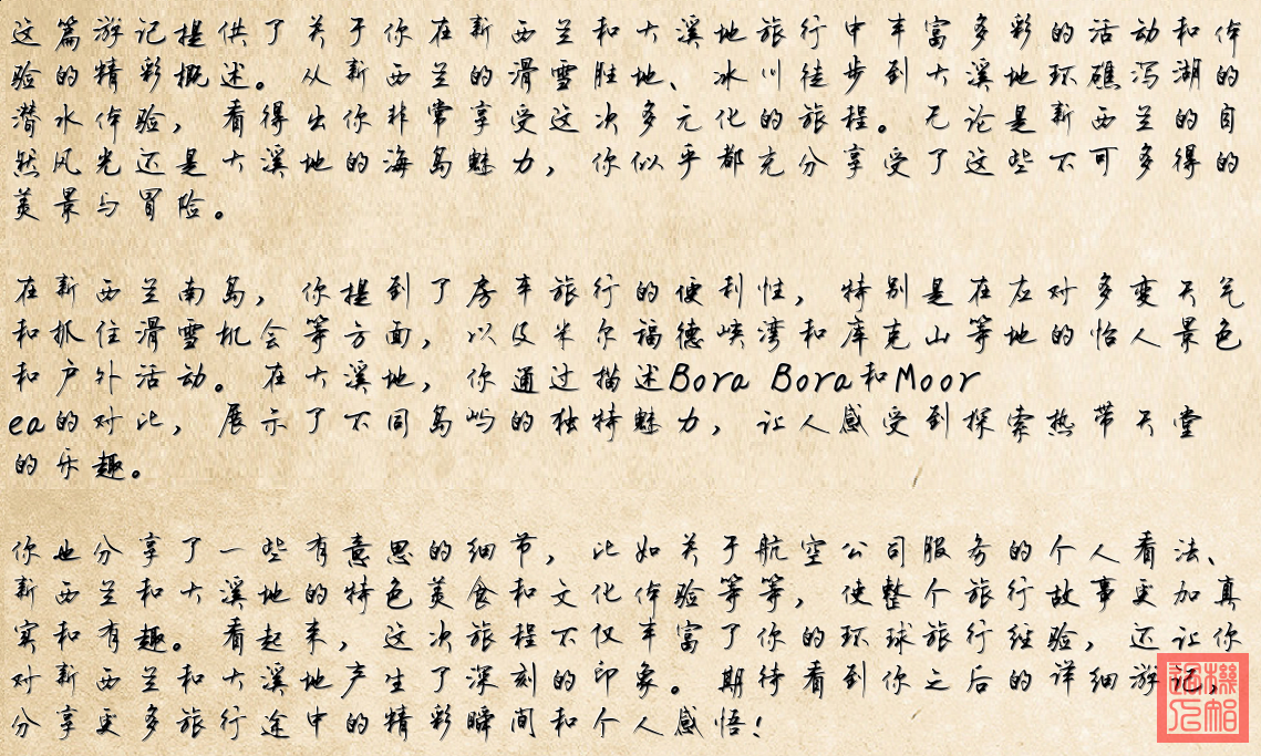 這組旅行照片和說明展示了從九月初到十月上旬的一次豐富多彩的南太平洋旅行,包括新西蘭和大溪地群島的多個目的地。這次旅程跨越不同的季節,涉及多種活動,如滑雪、直升機滑雪體驗、冰川徒步、峽灣皮劃艇等。在大溪地,旅程包括潛水和水上茅草屋住宿。