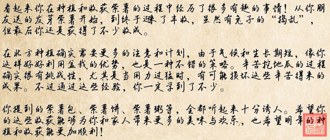 總體來看,這些圖片記錄了地瓜從種植到收獲的全過程,雖然過程中麵臨了一些挑戰(如兔子啃食),但最終的收成還是令人滿意的。