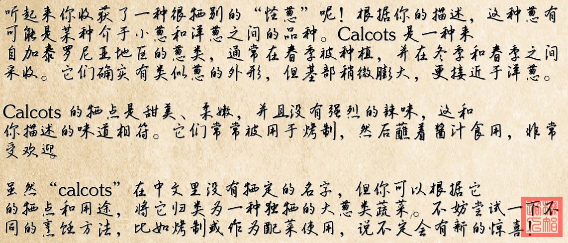 這些“怪蔥”看起來是植株比較高且頂部有點膨大的蔥類植物。根據你的描述和圖片,這種植株有點像“calcots”,是一種在加泰羅尼亞地區常見的甜味蔥。Calcots的特點是葉子長,基部略膨大,口感甜而不辣。由於生長環境和栽培方法的不同,也可能與普通蔥不同。