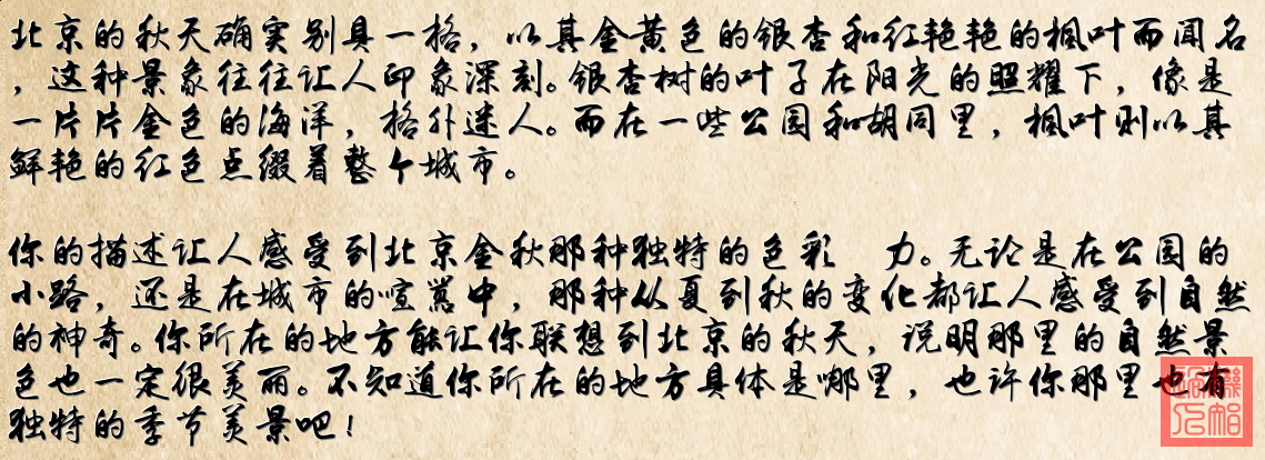 楓葉紅 銀杏黃 湖水倒映著天光 黑天鵝 輕輕蕩 劃開滿池的秋涼 從夏末到霜降 總想起那座城 每片落葉都在說 北國的風 街巷裏 槐花香 變作梧桐泛金黃 四合院 灰瓦上 停著午後的暖陽 推開窗望遠方 天高雲淡的晴朗 這畫麵多像故鄉 教我難忘 時光啊 請慢些走 讓思念 在湖麵停留 看那色彩 層層疊疊 都是記憶裏的溫柔 南北相隔 山水長 卻共賞 這秋色蒼茫 當風吹過 粼粼波光 聽見故都在歌唱