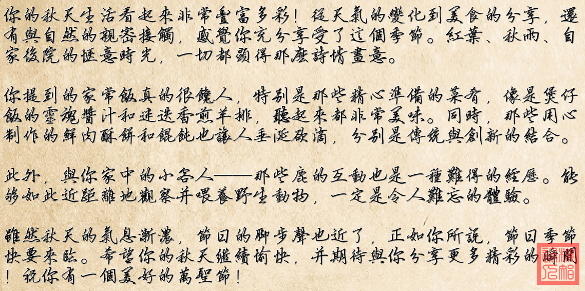 圖文結合展示了秋季的自然景色、美食以及與動物的小互動。祝大家秋天愉快!