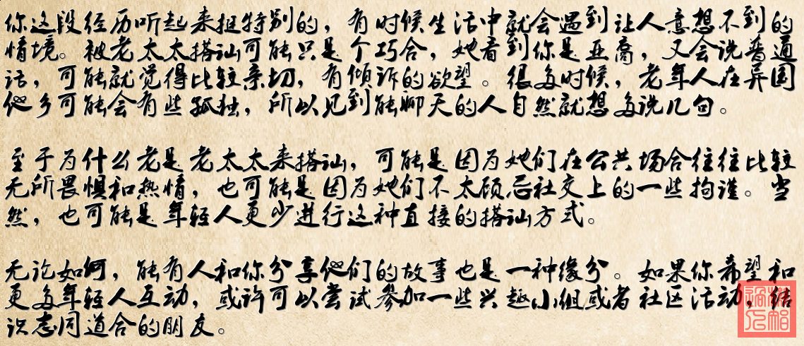 《拐杖追不上晚風》 快門聲驚醒了晨露 鏡頭對準前院蘑菇 我快步穿過林蔭路 她突然用中文打招呼 銀發被晨光染成金線 老花鏡滑到鼻尖 拐杖敲著人行道的琴鍵 追趕我匆忙的節奏線 我放慢奔跑的腳步 聽她講紫禁城的下午 女兒嫁到這片大陸 梧桐葉落滿新大陸 購物袋裝著隔洋的牽掛 找不著人說說家鄉話 我們數著貨架上的時差 聽硬幣在收銀台落下 為什麽總是銀發在漂泊 在異國街頭尋找耳朵 我也在等待某個巧合 年輕的笑容對我說嗨 當暮色爬上她的皺紋 我接過沉甸甸的見聞 兩個時區在掌心延伸 變成她眼裏閃爍的星塵