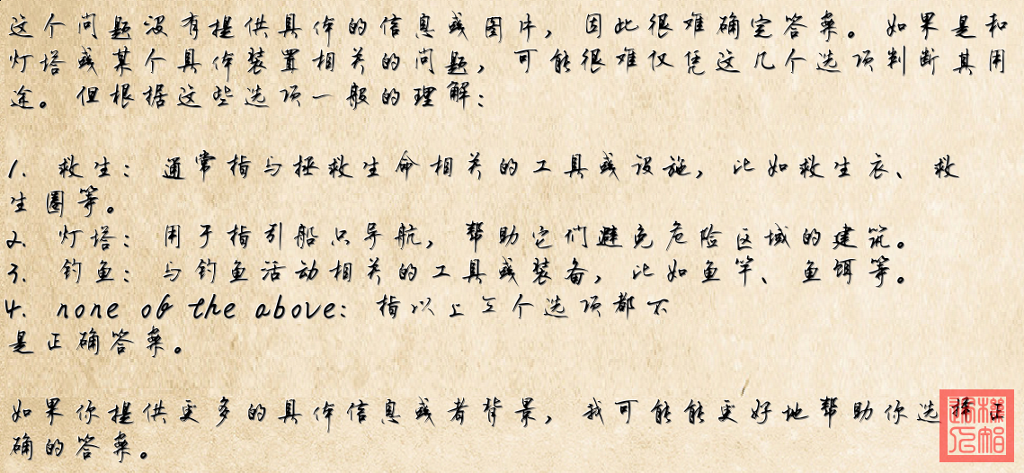 這看起來像是一個浮標,通常用於導航或海洋監測。根據外觀和結構,這個裝置可能並不是專門用於救生、燈塔或釣魚。更可能的是用於海洋觀測或能源采集,比如波浪能發電裝置。因此,最有可能的答案是"none of the above"。