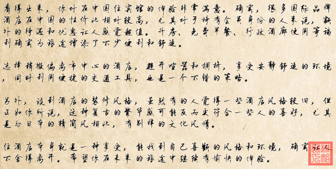 從描述中可以看出,這是一家高檔酒店,住客享有升房禮遇,並對酒店設施和服務如早餐和行政酒廊感到滿意。整體來看,環境安靜,設施齊全,性價比高。