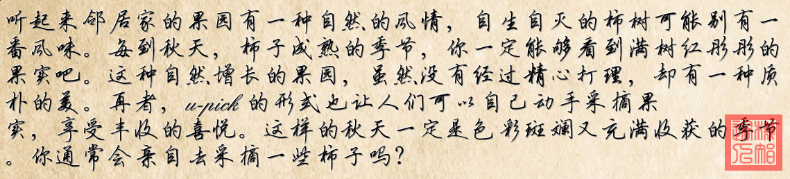 《柿野》 秋風翻過矮牆頭 荒園裏掛滿小燈籠 十年墾荒夢 沉進泥土中 隻剩枝頭點點紅 竹籃接住斜陽影 指尖沾滿秋意濃 誰家舊籬笆 守著半坡夢 年年霜降更從容 山路彎彎雲腳低 野柿垂首向秋空 當初種樹人 去了城市東 留下甜霜吻西風 提籃穿過枯草叢 鞋底沾著陳年夢 嚐口秋滋味 甜中帶澀重 像那年不告而別的相逢 滿山寂靜的橙黃 比晚霞更暖三分 摘顆柿子輕輕放 裝進衣兜帶走秋光