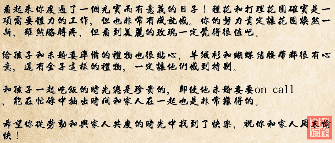整體來看,這些圖片反映了一個愜意、充實的生活日常,包括家庭互動、送禮、園藝愛好和外出用餐。沒有涉及到什麽新聞事件。