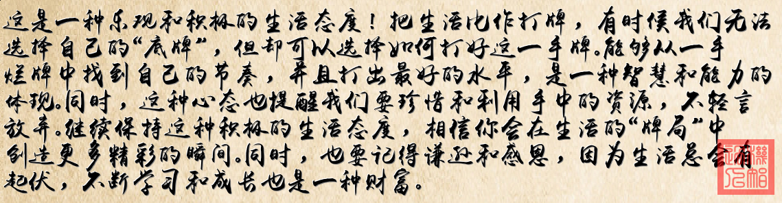 《爛牌玩家》 牌桌上煙霧繚繞看不清表情 籌碼堆砌著多少貪婪的野心 他們手握同花順卻猶豫不定 我在角落裏整理著殘缺的幸運 有人把王炸拆成單張出 有人把順子打成了散牌路 我數著手心皺巴巴的梅花三 卻看透了這場遊戲的荒誕 曾經我也幻想過滿手好牌 直到命運發來滿把的意外 學會在絕境裏計算概率 把每張廢牌都變成奇跡 當莊家再次洗牌的時候 那些好牌玩家早已退後 隻剩我還在牌局裏微笑 用最爛的牌打出最漂亮的招