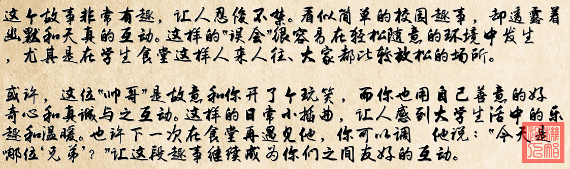 - 內容概述:一位常在食堂見到的帥哥因為經常穿不同的衣服自稱有雙胞胎兄弟,引發了關於他到底是“哥哥”還是“弟弟”的誤解,最終揭曉其實他根本沒有雙胞胎兄弟。