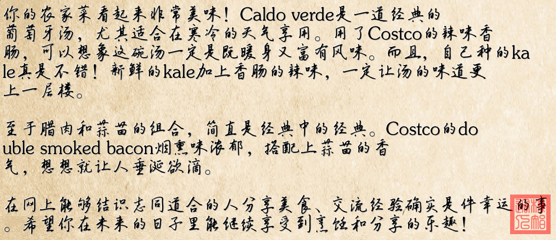 - 這道湯用Kale(羽衣甘藍)和辣味香腸製作。