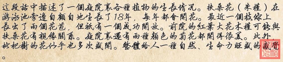 1. **扶桑花(朱槿)**:透露出一種活力和生命力。文中提到這盆扶桑花已有18年曆史,一直放在遊泳池旁。