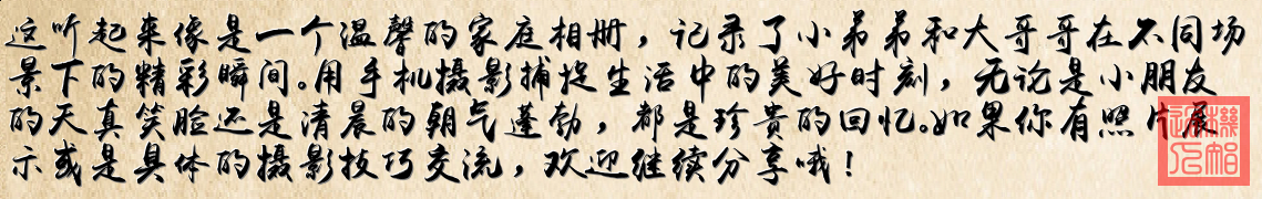 《時光剪影》 晨光爬上窗台 喚醒惺忪的期待 你抱著小熊搖搖擺擺 在爬行墊上畫下未來 哥哥係好紅披風 把清晨裝進口袋 蜘蛛俠麵具閃著光 整個童年都變得澎湃 陽光在睫毛跳舞 笑聲把雲朵染白 你咿呀學語的模樣 是春天寫下的對白 哥哥追逐著泡泡 把快樂裝滿懷 兩個小小身影 編織著家的依賴 時光按下快門 定格成長的節拍 從蹣跚學步到奔跑 愛是永不褪色的存在 晨光裏兩個身影 一個在追一個在等待 這是最溫柔的風景 藏在歲月的口袋