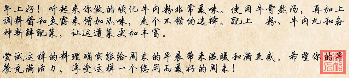 《晨光裏的順化香》 晨霧漫過廚房窗台 牛骨在鍋裏輕輕搖擺 熬過漫漫長夜的等待 化作白霧嫋嫋散開 醬料落進湯裏綻開 魚露沿著勺沿滴下來 燙熟的米粉雪白 配上翠綠香菜 牛肉丸在碗中浮沉 豆芽咬碎清脆聲音 九層塔香氣正溫存 喚醒沉睡的味蕾 熱湯入口驅散晨困 額角滲出細密汗珠 周末早晨如此豐盛 幸福在舌尖駐足 這碗湯裏有光陰 慢燉出生活的詩意 尋常食材巧相遇 化作晨光裏的小確幸