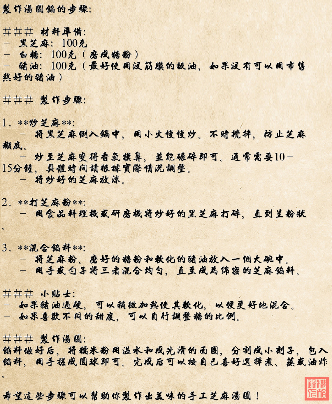 整個過程中,芝麻餡的製作需要將芝麻炒熟並打成粉,然後與糖粉和豬油按照1:1:1的比例混合。包湯圓的步驟略去不提,顯示製作過程相對簡單。